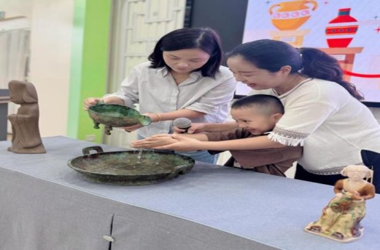 10月15日,江宁博物馆的“文物使者”带着千年故事走进竹山幼儿园,用可触、可玩、可听的方式,让竹幼娃娃们踮起脚尖就能“触碰”家乡的文明记忆。课堂一开始,讲解员就把匜、盘和陶佣、瓷佣四件仿制品摆上桌,瞬间吸引了孩子们的目光。“快看!这是古代人的洗手套装!”活动刚开场,讲解员摆出的匜与盘仿制品就圈住了孩子们的目光。小朋友现场体验:青铜匜倾斜,清澈的水流顺着弧形流槽缓缓浇在手心,脏水刚好落进下方的浅盘里,原本陌生的文物瞬间变成了“好玩的玩具”。在趣味互动中,孩子们悄悄种下了守护文化遗产的种子。