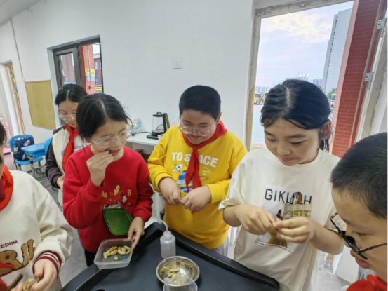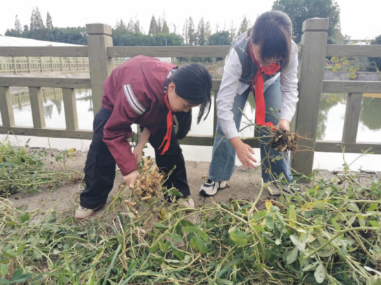 禄口小学劳动社团的20余名成员也走进校园劳动实践基地,开展“采收花生”主题劳动活动,在基地里体验农耕乐趣,感受劳动价值。活动伊始,关工委的老师手持成熟的花生植株,详细讲解花生的生长特性与采收技巧:“抓住植株根部轻轻向上拔,就能看到藏在土里的‘小宝藏’啦!”同学们听得认真,随后两人一组,动手实践。当带着泥土清香的花生串被拔出时,孩子们的欢呼声此起彼伏,分享收获的喜悦。社团成员王梓轩捧着装满花生的篮子说:“原来花生长在土里,拔出来的时候特别有成就感,以后我会更珍惜粮食!” 最后,孩子们品尝着自己亲手采收的花生,香甜的滋味在舌尖蔓延,劳动的快乐也深深印在心底。