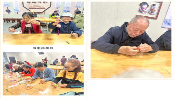 活动尾声,基地工作人员还组织退休教师开展中药荷包制作体验活动。老师们兴致勃勃地学习穿线、填充、缝合技巧,互帮互助完成手工制作,现场笑声不断。学校还特意为老师们准备了菊花糕、菊花茶等重阳节传统美食,在暖胃的同时更暖人心。