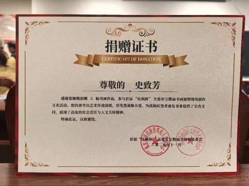 2025年11月,江宁实验小学退休教师、前退教协会会长、区退教协会理事史致芳老师,慷慨捐赠5幅精心创作的书画作品,鼎力支持首届“红枫杯”关爱孤独症微扇书画展暨现场创作义卖活动。
