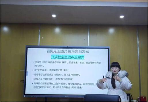 在“开放的教室”理念指导下,周老师分享了自己的带班育人方略和实际做法,从教育空间、课程内容、教学过程和互动方式四个方面举例详细说明。教育空间是把固定的课堂变成灵活的成长场,周老师组织学生们开展各种活动,比如主题班会、演讲比赛等;课程内容的开放是突破学科界限,整合多元文化知识,周老师的英语课上也会和孩子们一起回忆相关的历史知识。教学过程的开放是以学生为中心,开放教学内容;周老师每节课前会给学生5分钟,开设“小老师讲堂”,周老师作为听众参与进去,尊重学生的知识输出。最后一个是互动方式的开放:从师生单向到多维联动,集合学校、老师、家长所有的力量。
