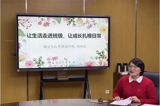 南京市江宁高级中学关工委的林秦怡老师就“为何要构建开放的教室”、“如何构建开放的教室”两个探究问题结合自己的带班经验以及“承露青年”的培养工作,通过三个维度系统构建螺旋上升的开放式育人课程做了深入细致地分享。即:开放的情感场域:从“情感淡漠”到“共情感恩”。面对初始的情感疏离,设计三阶情感联结课程;开放的生命场域:从“被动接受”到“主动体验”。借鉴塞利格曼的PERMA模型,将学校各类活动整合为开放的生命教育课程;开放的担当场域:从“回避责任”到“主动肩负”。针对学生责任感缺失问题,创设从微观到宏观的担当实践课程。