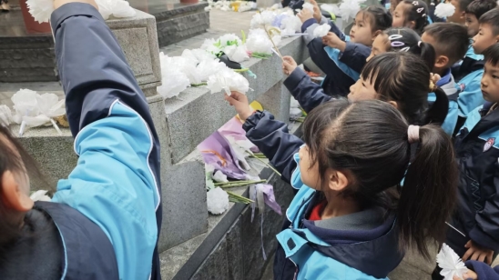 “缅怀革命先烈,传承红色基因;好好学习,天天向上;时刻准备着,为共产主义事业而奋斗!”稚嫩却坚定的宣誓声回荡在烈士墓前,少先队员代表们高举右拳,庄严宣誓,表达了继承先烈遗志、勇担时代使命的坚定决心。仪式结束后,师生们有序列队,手持亲手制作的小白花,缓步走向烈士墓,将洁白的花朵轻轻敬献于墓前,低头鞠躬致敬,以最真挚的方式告慰英烈忠魂。孩子们目光专注,神情肃穆,每一个动作都饱含对先烈的敬仰,每一次鞠躬都传递着传承精神的决心。