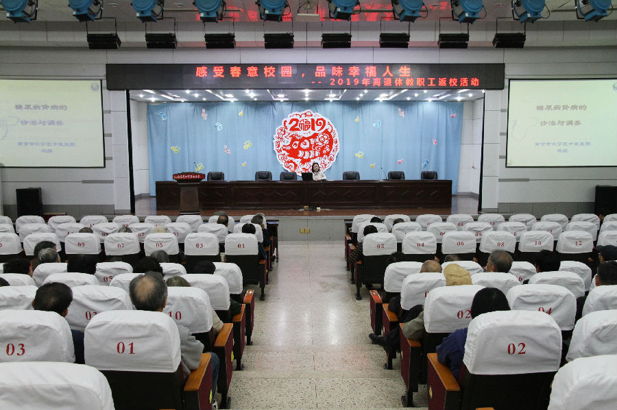 2019年4月22日星期一,江宁高级中学离退休教职工进行了返校活动。上午9点钟左右七十几位老教师陆陆续续来到了学校二楼报告厅。2019年老教师们的第二次集中,见面,大家都很高兴!9 :30,区中医院宋扬主任给老教师做了老年养生保健讲座,重点介绍了糖尿病和肾病的预防、治疗及日常生活中饮食等方面的注意事项。宋主任深入浅出,浅显易懂的讲解,使老教师们收益非浅。接着由我校音乐教师王晓玲老师给老教师们宣传了唱歌对养生保健的作用,鼓励大家平时多练声、多发声,学会用丹田之气唱歌,而不是大白嗓子,声嘶力竭的喊歌。葛敏会长结合自身谈了唱歌收益的体会,鼓励并动员有条件的老师星期五上午能到学校来参加校退教协合唱团的活动!最后,朱金宝老师根据区退教协工作布置结合我校具体情况作了详细解读。会后还将有关具体事宜的讲话稿印发给大家,使每位老教师对一些涉及到自己的相关内容做到心中有数!中午徐斌校长。陈再平书记、工会主席周丰梅等校领导和老教师们共进了午餐。至此,老教师们愉快地度过了这一次的返校活动!