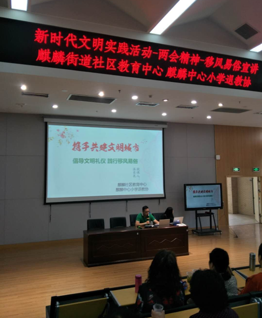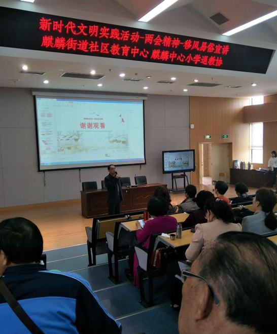 2019年4月25日上午,麒麟街道社区教育中心的陈彬校长,麒麟小学退教协会的陈光明会长,组织麒麟街道的全体退休教师,在麒麟小学的阶梯教室学习了“新时代文明实践活动:两会精神——移风易俗宣讲”。
