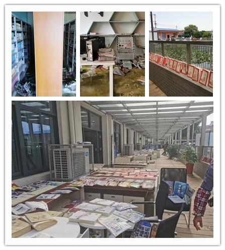 周三上午,天气放晴,在校长马勇的带领下,动员部分行政、教师及六年级学生参与搬移受淹图书、沙发、桌椅等。很快一张张沙发被搬至阳光房走道上,一本本图书晾晒在阳光房走道桌面上……图书管理员张承明既要忙家里自救,又要忙图书室清扫、整理、消毒,一片狼藉很快变新样。