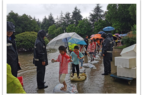 陆郎城管中队接到学校求援电话后,紧急调集精干队员赶到学校排水。他们穿着雨衣、高筒胶鞋奔波于停车场与总排水口之间。有的敲开阴井盖疏通排水口,有的找来小型抽水机接电抽水,有的搬运沙袋备用……忙碌了一上午,城管队员们顾不上休息,也顾不上喝水。