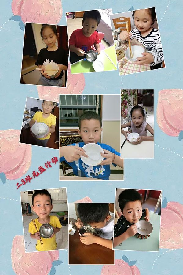二年级各中队的队员们为了将“光盘”节约行动进行到底,年级部组织队员们在家践行光盘行动,瞧瞧他们厉行“光盘”是多么的骄傲和光荣啊。