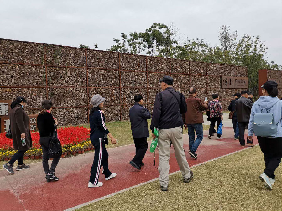 下午,老教师一行前往“网红”打卡地——汤山矿坑公园,老师们笑着说他们也学年轻人去赶个时髦打个卡。汤山矿坑公园是在原有的废弃采石宕口的基础上进行修复改造的,有几个年纪特别大的老师由于身体的原因没有爬山,选择在旁边的湿地湖泊区小憩,大部分的老教师还是健步去往公园的高处,踏上弧形空中走廊,远眺公园全景。