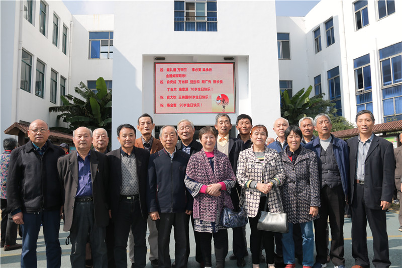 十点多钟,大家回到铜小,欢聚阶梯教室。少先队员们表演了精彩的文艺节目,并送上了美好的祝福。也许是情到深处,老教师们情不自禁,纷纷上台即兴演唱了动听的歌曲。场下掌声、欢呼声响成一片。他们用歌声表达对党的热爱,歌唱今天的幸福生活。接着,举行的“祝寿、庆婚”仪式,将活动再一次推向高潮。少先队员们为整七十、八十的老教师送上鲜花,为钻石婚的教师戴上胸花、系上红领巾。戴军校长上台同他们一一握手,并送上了祝福和“温暖”。会场上下不约而同地响起了经久不息的掌声。此时,已是午餐时间了,可大家意犹未尽,纷纷牵手来到学校电子屏下合影留念。