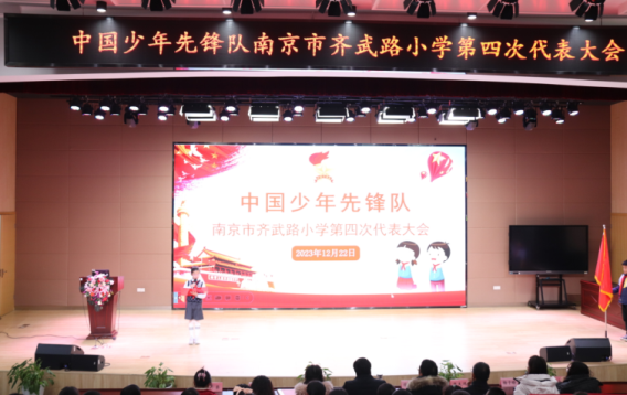 2023年12月29日,中国少年先锋队南京市齐武路小学第四次代表大会在报告厅举行,学校少工委领导、关工委领导、辅导员老师、少先队员代表参加本次会议。会议伊始,少先队员代表为到会领导献上了红领巾。紧接着出旗,队员们神情庄重演唱了《中华人民共和国国歌》、《中国少年先锋队队歌》。