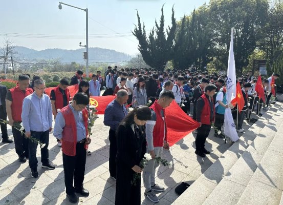 随后,党、团、少先队员集体默哀,瞻仰纪念碑,依次将白花摆放在烈士墓前,并深深鞠躬,向革命烈士表达无限敬意与哀思。