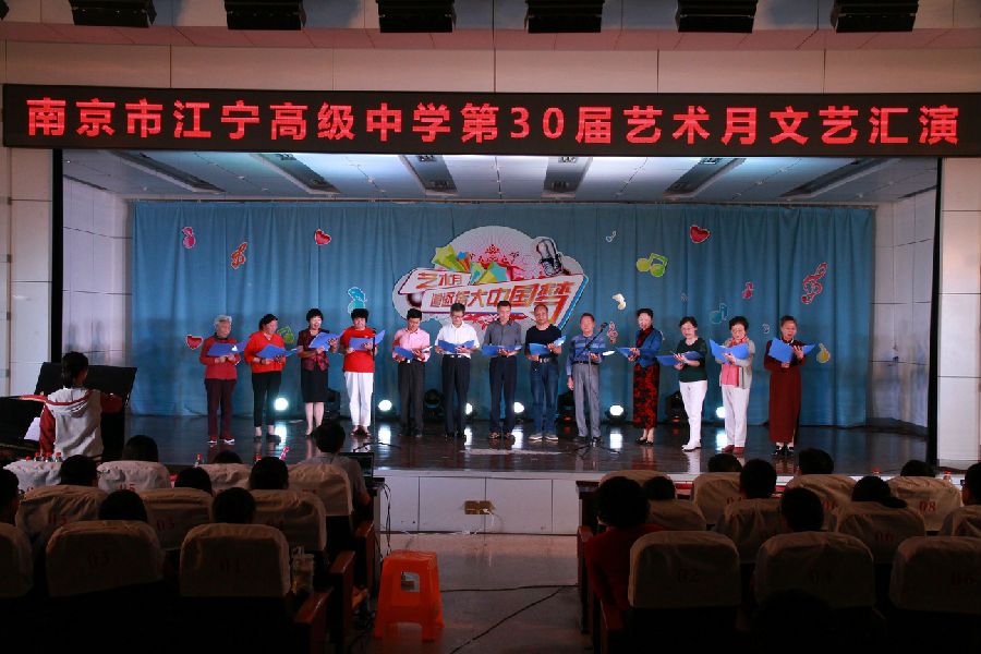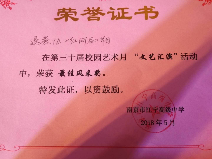五月二十七日晚上,江宁高级中学第三十届艺术月文艺汇演在学校艺术楼二楼报告厅拉开了帷幕!我们校退教协合唱团的老师们在音乐老师王晓玲精心指导下,排练了一首歌曲“红河谷”参加了这次的演出! 学生对老教师能和他们一起参与艺术月的活动,都感到非常高兴,对于我们的演出给了很高的评价!学校给我们这个节目颁发了“最佳风采”奖!老教师们对能够和学生们一起活动也感到非常高兴!