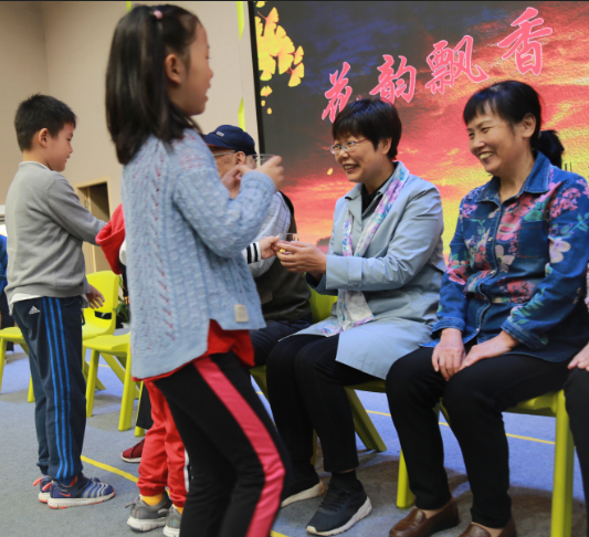 活动中孩子们为爷爷奶奶们精彩的节目,有歌唱《不上你的当》、《祖国祖国我们爱你》、舞蹈《奔跑吧》、《快乐足球》等精彩的节目。看着孩子们的表演,老人们乐得笑开了花。节目过后孩子们依次上台,为爷爷奶奶、姥姥姥爷敬茶,双手握杯,深深鞠躬,敬茶仪式代表一种对祖辈的尊敬,也表达孩子们深深的祝福,祝福我们的爷爷奶奶们福寿安康。活动的最后环节是插花,老人带着自己的孙子、孙女享受着与孩子一起插花的快乐,老人和孩子们融入到了浓浓的祖孙情中,此时此刻,花香弥漫,幸福传递。