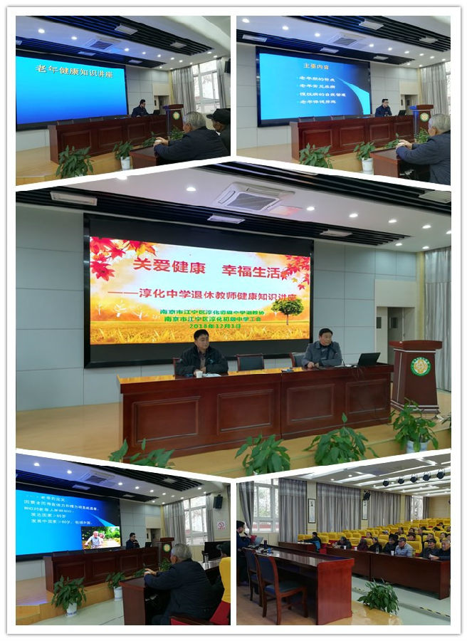 12月1日,在这个微寒的早晨,淳化中学退休教职工继重阳节出游之后,又一次欢聚一堂,大家都高兴的来到报告厅,准备聆听淳化社区卫生服务中心全科主治医生、紧急救护培训师、心理咨询师刘飞鹏医生,为我们退休教职工准备的健康知识讲座,刘飞翔医生结合多年的临床经验和老年人的身体特点,设置此次讲座的内容,其中包括老年期的特点、老年常见疾病、慢性病的自我管理、老年保健措施等四大部分。