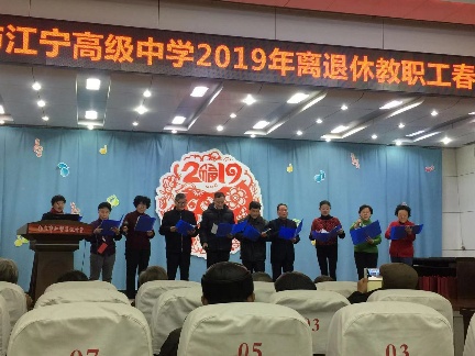 2019年1月28号上午9:30在江宁高级中学的报告厅举行了2019年江宁高级中学离退休教职员工春节团拜会。学校领导徐斌校长、陈再平书记、工会主席周丰梅、校离退休协会葛敏会长及魏为从主任参与并主持了此次活动!会议开始前校退教协合唱团的老师们及赵典昌、巫秀美、汪绮年等老师分别表演了四个节目作为暖场,将全场的气氛推向高潮!陈书记、周主席分别为两对钻石婚、八对金婚老师夫妇准备并颁发证书及赠送礼品,为每对夫妇拍照片以作纪念。另为3位90岁、2位80岁、5位70岁整生日的老师准备并佩戴了胸花,赠送生日蛋糕券,拍了合影照片留念。徐斌校长向老教师们汇报了2018年学校的教学成果以及对未来的展望!中午在学校食堂共进了美味可口的午餐,全体来参会的老教师们都感到特别的愉快!