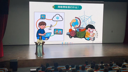 讲座伊始,校关工委袁老师以通俗易懂的语言阐释网络基本概念,随后结合青少年上网实际,层层递进地剖析网络空间的复杂态势。她始终坚持“客观辩证”的讲解原则,既充分肯定网络的积极价值,也不回避其潜在风险,让同学们对“网络是一把双刃剑”有了更深刻的认知。