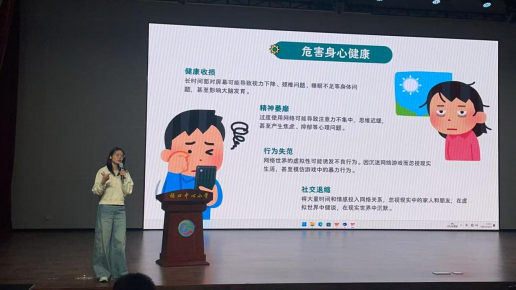 在网络优势的讲解中,袁老师指出,网络已深度融入青少年学习生活,成为查阅学习资料、拓展知识边界的“智慧助手”,也是聆听音乐、观看动画的“娱乐伙伴”,极大地丰富了同学们的精神文化生活。但话音一转,她着重强调,网络若使用不当,便可能沦为吞噬时间与精力的“大沼泽”,沉迷其中会对学习生活造成严重干扰。